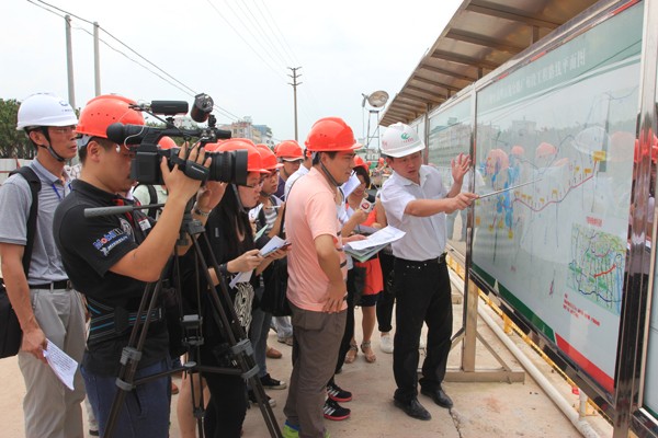 2014年6月5日,廣明高速SG06標(biāo)項(xiàng)目部作為廣明高速媒體行活動的第一站迎來了境內(nèi)外24家媒體的30余位記者,分別就項(xiàng)目亮點(diǎn)、施工進(jìn)展等方面進(jìn)行了全面詳細(xì)的說明并接受專題采訪。
