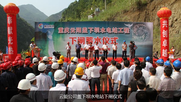 2012年8月10日,重慶云能投資興建的重慶市云陽(yáng)縣蓋下壩水電站工程成功下閘蓄水。10時(shí)18分,隨著云陽(yáng)縣委書(shū)記李洪義的一聲令下,巨型閘門(mén)穩(wěn)穩(wěn)落在導(dǎo)流洞進(jìn)口閘槽底部后,下閘蓄水宣告圓滿(mǎn)成功。